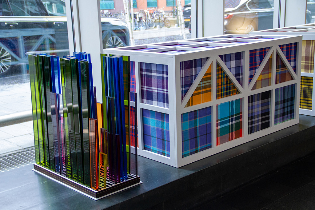 Digital Patchwork Framed Mamjo Sculpture Installation (DPFMSI) is an installation consisting of three parts. Two elements each show a mosaic of fabric patterns on a white wooden frame sculpture. They are fabrics from the Maroon culture. The strict lines of the white frames refer to the modernism of, for example, De Stijl and artist Mondriaan. The third element is made of plexiglass and is a free, three-dimensional translation of a spreadsheet with colored areas.