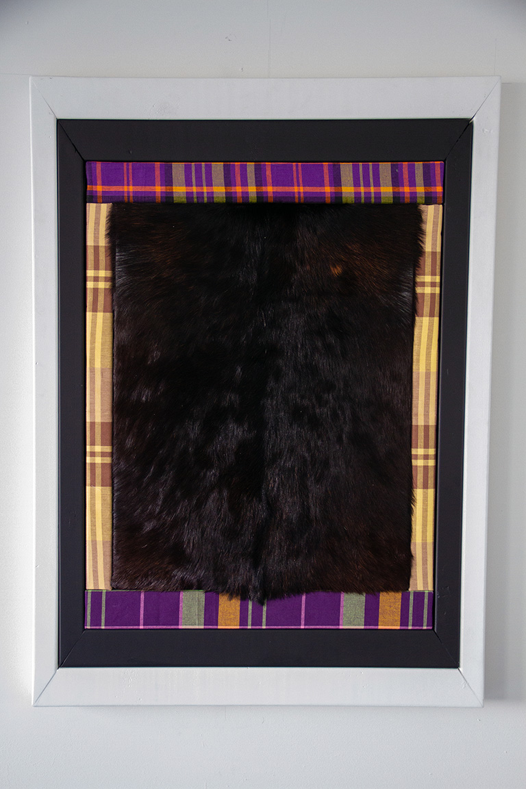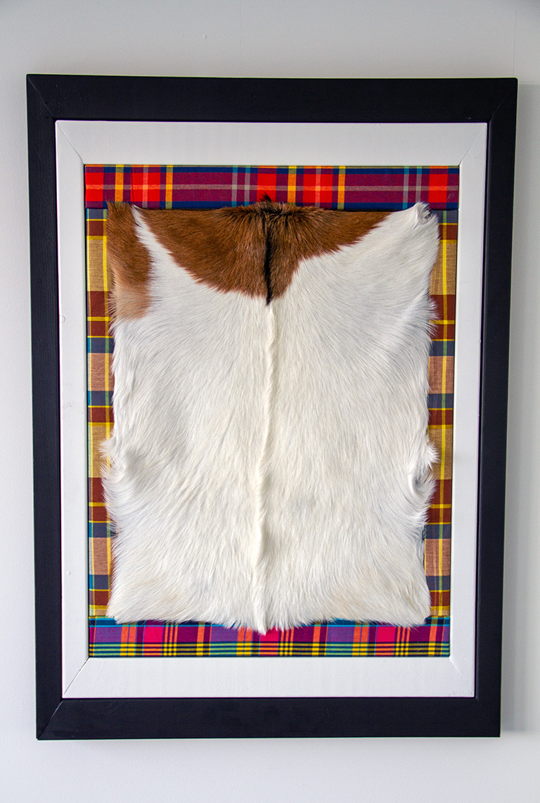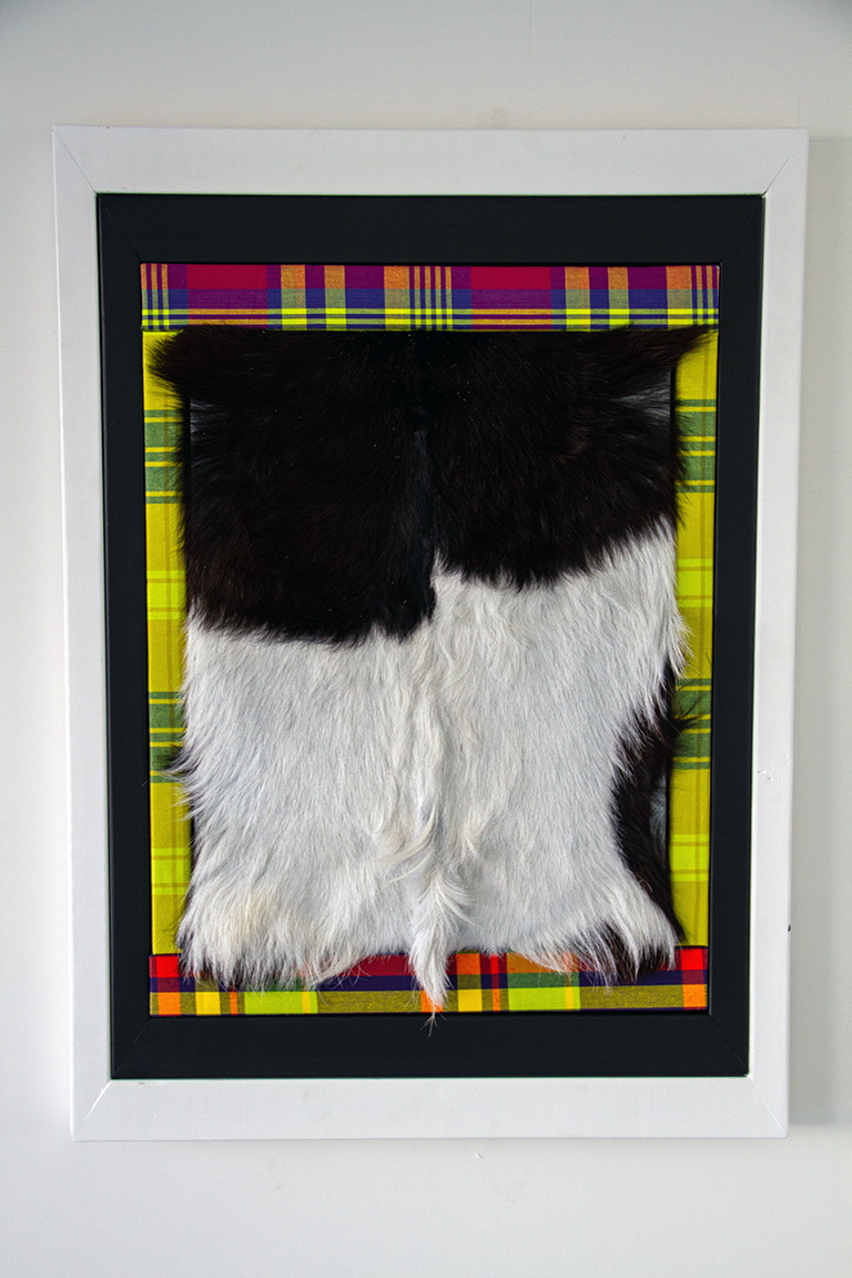 This triple art frame encases a goatskin leather and tells a symbolic story: the story of an enslaved woman who was as much a part of the slave owner’s inventory as his livestock. The woman and the goat were both chained to be useful in production processes. With her forced labor and reproduction, women ensured the survival of the slavery system.
